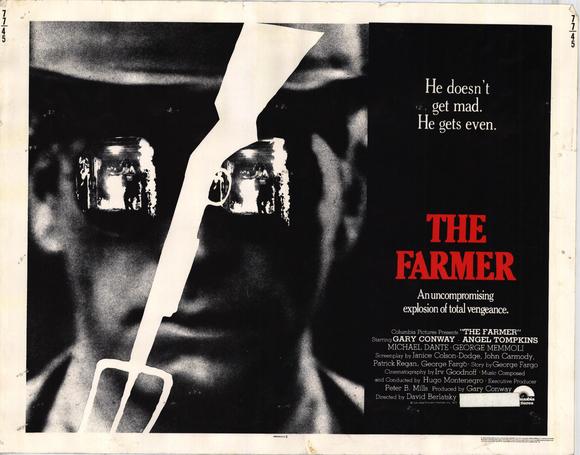 Many movies unavailable on DVD are difficult to find, but if you beat the bushes with hard work and patience (online traders, DVD-Rs at collectibles shows, long out-of-print VHS tapes), most’rare’ movies can eventually be tracked down. Then there are movies like THE FARMER. I saw the violent revenge thriller THE FARMER at the I-44 Drive-In movie theater in Valley Park, Missouri in 1977 on a double-bill with John Flynn’s THE OUTFIT. It’s a vivid memory and I recall my friends and I loving it and talking about it for months after. I began collecting movies in the early 80′s and just assumed THE FARMER would one day find it’s way into my collection. But I’ve searched far and wide and here it is 2009 and, after years of it topping my want list, a return visit to THE FARMER has eluded me. When I mention the title to fellow movie collectors, they either shrug their shoulders or they quote the poster’s tag line and say “Ah yes, THE FARMER. He doesn’t get mad. He gets even!”