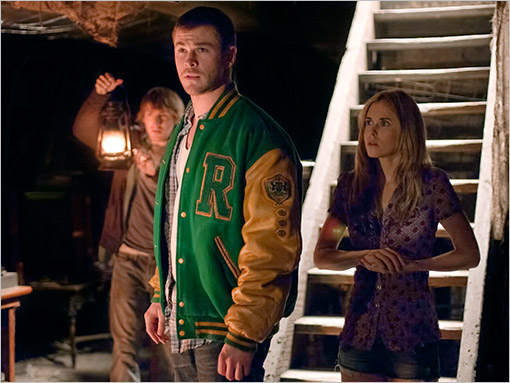 And what are those recognizable ticks? Try the film’s spoiler-free breakdown on for size: Five party-seeking college kids, including such overused archetypes as the affable jock (Chris Hemsworth), the wisecracking stoner (Fran Kranz), and the kinky sexpot (sexy Aussie Anna Hutchison), head off to the athletic heartthrob’s cousin’s secluded nook located deep in some far-off woods. Once there, their shared agenda merely consists of getting drunk, having sex, and smoking Mary Jane, but, as early as Cabin’s intentionally off-putting and seemingly out of place first scene, it’s clear that there’s a much larger, conspiratorial plot going on beyond the kids’ control.