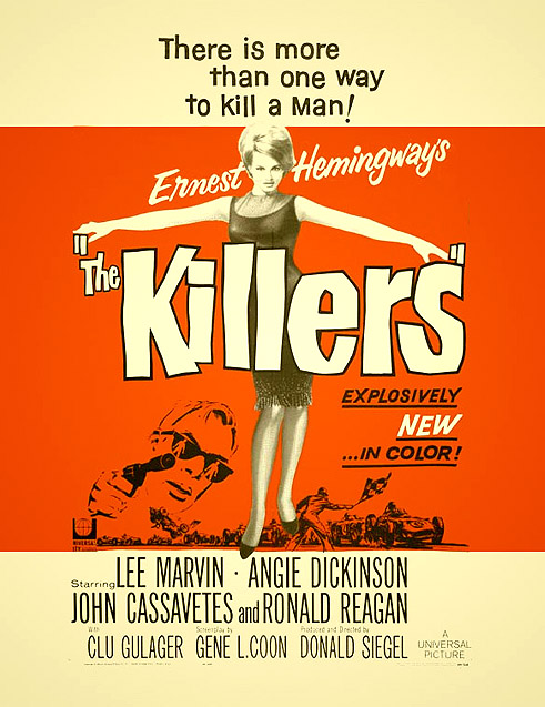 This remake of the classic film with the same name (1946) by Robert Siodmak deals with two hired killers (Lee Marvin , Clu Gulager in similar role to William Conrad and Charles McGraw) who murder a man (John Cassavetes replacing Burt Lancaster) at a blind school . The cold-bloody assassins look into his past and by means flashbacks , attempting to solve leads as to why their victim calmly waits for his death and find tracks to a 100.000 dollars robbery . The gunmen discovering his involvement with crime boss (Ronald Reagan , alike role Alfred Dekkker ) and the gangster’s moll (Angie Dickinson in the character of Ava Gardner).