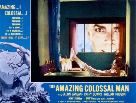 My very favorite of them was a diptych: “The Amazing Colossal Man” and its sequel, “War of the Colossal Beast.” Glenn Manning (played by Glen Langan), a soldier in a trench at the perimeter of the site of an impending atom-bomb test becomes a hero when, during the countdown to the blast, a pilot crashes a small plane nearby. Dashing out of his trench to try to save the pilot, Glenn is gravely burned in a shower of nuclear debris, but, somehow, survives. Not only does his skin suddenly heal, but he begins to grow, and keeps growing, turning into an angry freak, demented (the “science” being that his brain doesn’t keep up with the rest of his growth) and dangerous. In the sequel, he survives a calamitous fall at the Hoover Dam after a military assault, and comes back more monstrous and madder than ever (“Glenn! Put the bus down!”).