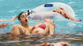 Maddy runs into some old friends and provides the film with a bunch of really good looking people to be horribly murdered by the mutant piranha that begins to terrorize their town. Every character is right out of the B-movie handbook. There’s Kyle (Chris Zylka), Maddy’s old boyfriend and graduate of the Derek Zoolander School for Modeling; the nerdy Barry (Matt Bush), who pines for Maddy and is conveniently a marine biologist; and a few super-hot girls who exist for no other purpose than to provide erections and die.