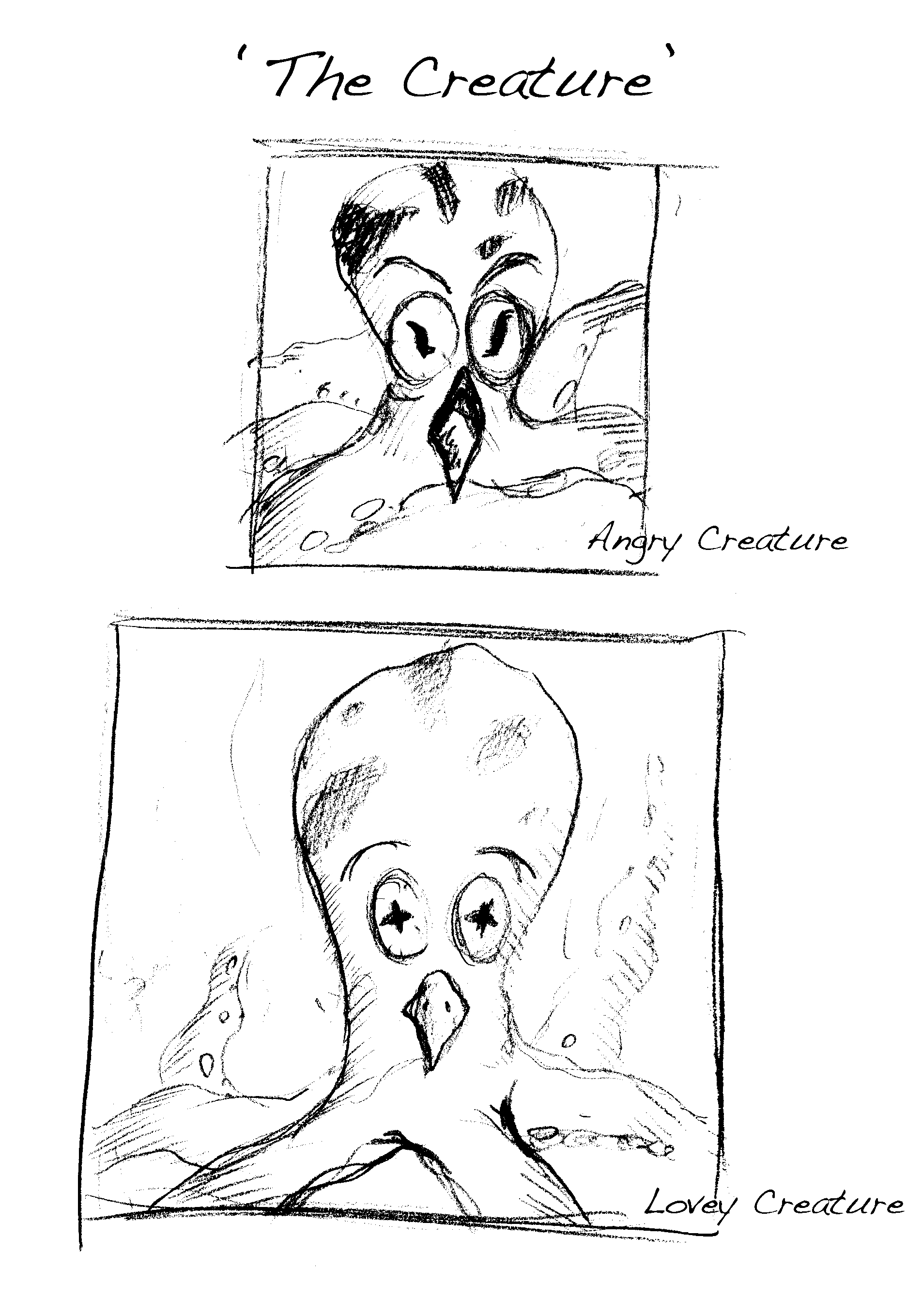 MICHAEL: The creature was an eight-inch tall sculpture I made and shot on a green screen. The “lovey” face, was made separately and composited onto the “angry” creature. He was made out of Sculpey over a wire armature. Sadly, our terrifying beast was broken during post-production. The tentacle you see in the film is a nine-foot long, wireframe structure, wrapped in painted fabric and stuffed with bubble wrap (to keep it light enough to float into the frames).