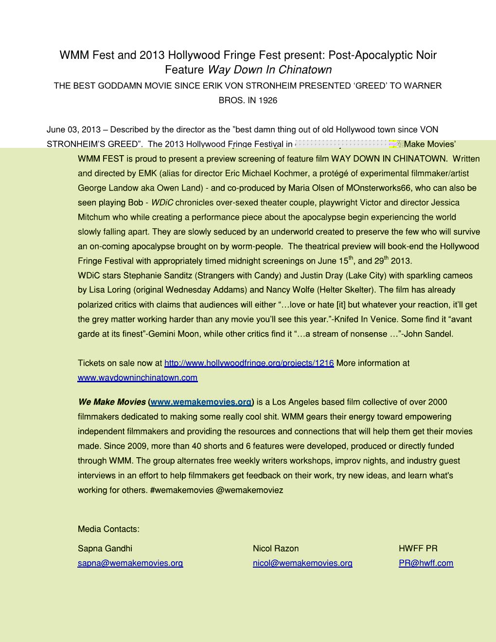 Following up on “Way Down in Chinatown,” http://www.bmovienation.com/?p=6960 the world premiere is the midnight show at the Hollywood Fringe Festival on June 15th. Since reviewing “W.D.i.C” here, the film has generated plenty of publicity and whether you love or hate it, it will have a lasting effect.