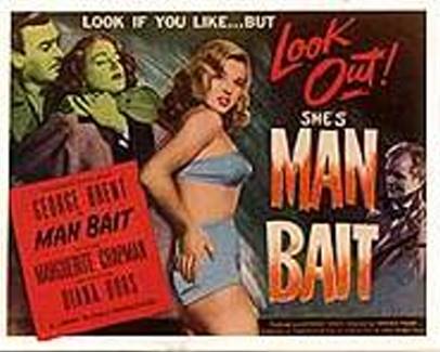 The film was deceivingly marketed in the United States as Diana Dors’ first movie, when, in fact, she had been making films for years. The ad campaign also played up the word “Stacked!” next to a photo of Dors clad in a bikini top. Sadly, the famous femme fatale of British cinema is dressed rather demurely throughout the film, save for a slightly sexy off-the-shoulder number she uses in the seduction sequence. However, the attempt to market this film as a cheap sexploitation movie undermines its merits. It’s a thoroughly engrossing story, well-directed and smartly paced throughout its 78 minute running time. Dors would go on to be known as a British Jayne Mansfield, rarely getting a role that stretched any dramatic talents she may have had. (She died in 1984 at age 52). Yet, her performance in Man Bait is impressive and indicated there was real talent that could have been exploited, had producers ever looked above her bust line. The primary weakness is the presence of George Brent in the lead. He’s stiff and boring and his performance is at odds with the far more natural acting styles of the excellent supporting cast (Peter Reynolds is exceptionally good as Dors’ manipulative older lover).