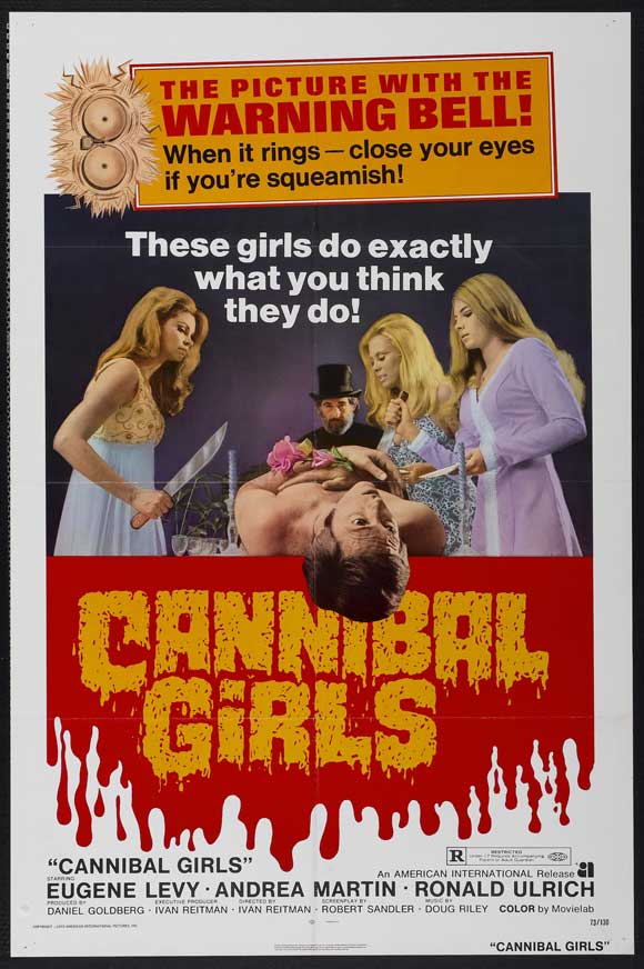 Even before Cannibal Girls, Reitman and his film partner Dan Goldberg had become infamous names in Canadian cinema circles for their daring student feature The Columbus of Sex, which landed the pair in the Ontario courts over obscenity charges (which were eventually dropped). After securing CFDC funding, the partners made a sexy college comedy follow-up Foxy Lady, but it was a mostly unsatisfying experience that encouraged Reitman and Goldberg to set their sights on the lucrative horror market, from which many enthusiastic young directors graduated to mainstream filmmakers. Shot for only $12,000 with a vague premise and largely improvised dialogue, Cannibal Girls is a fun little exercise in Canadian horror even though it doesn’t stand up to much scrutinythe story is frequently confusing, the acting sometimes suspect, and the extended dream sequence plot twist discouraging. While some of this can probably be attributed to the extensive re-shoots Reitman and Goldberg decided were needed to flesh out the story, there’s no denying that Cannibal Girls is a quintessential example of 1970s grindhouse cinemamessy, amateurish, crude and not afraid to wallow in its sleazy subject matter.